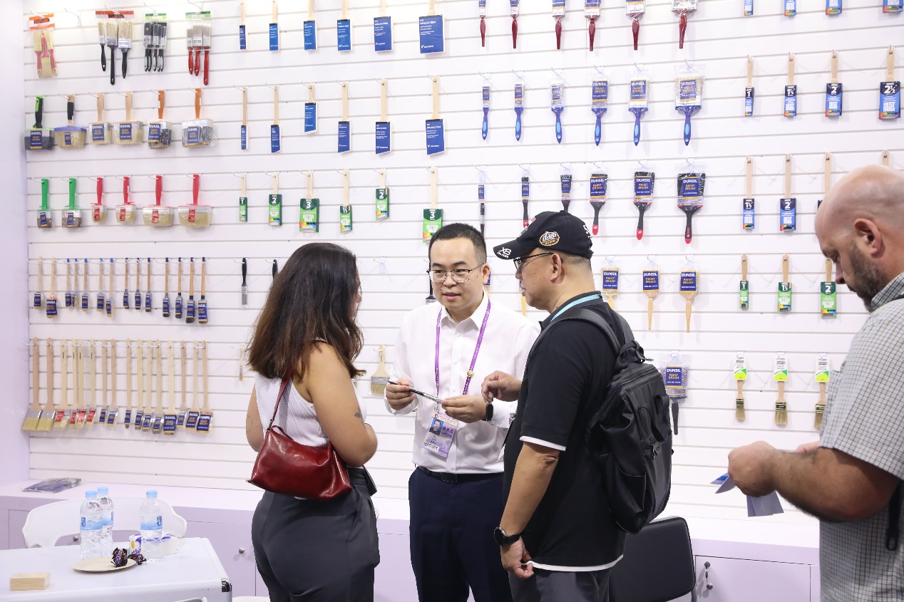 在第一期廣交會上,浙江土畜包括下屬輕工、盛力公司共有工具、五金、新能源等在內(nèi)的29個展位。公司老牌出口拳頭產(chǎn)品的漆刷展位積極順應綠色環(huán)保發(fā)展趨勢,帶來了用回收材料制成的油漆滾筒刷,并攜此產(chǎn)品參加了本屆廣交會新品發(fā)布活動。新能源展位作為新質(zhì)生產(chǎn)力產(chǎn)品開發(fā)前線,其光伏組件產(chǎn)品吸引了大量外商駐足和洽談。