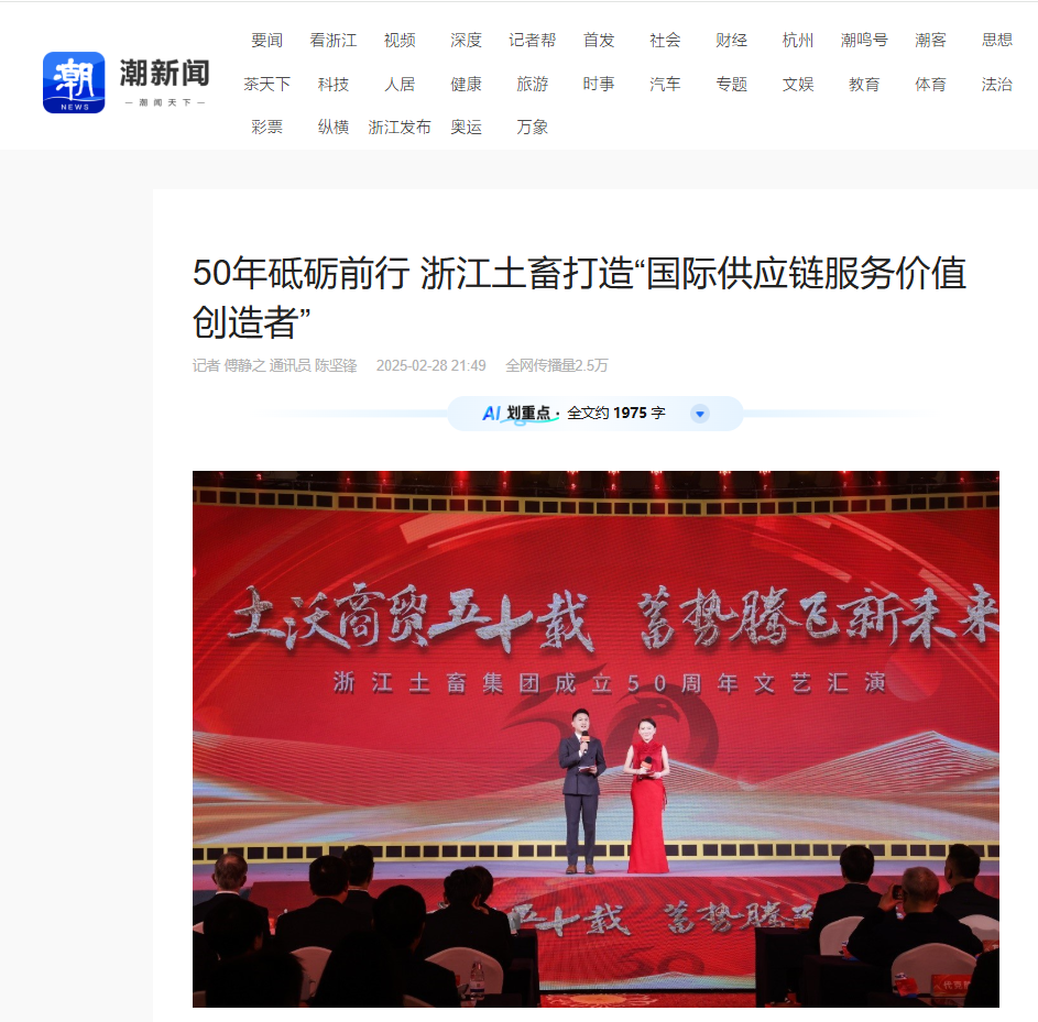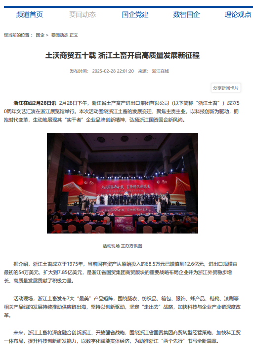 2月28日,浙江省土產(chǎn)畜產(chǎn)進(jìn)出口集團(tuán)有限公司(浙江土畜集團(tuán))在浙江展覽館舉行公司成立五十周年文藝匯演。本次文藝匯演以“土沃商貿(mào)五十載,蓄勢(shì)騰飛新未來”為主題,以“沃土育初心”、“跨越五十載”和“蓄力新時(shí)代”為三個(gè)篇章,邀請(qǐng)了中國食品土畜進(jìn)出口商會(huì)、中國紡織品進(jìn)出口商會(huì)、浙江省商務(wù)廳、浙江省農(nóng)業(yè)農(nóng)村廳、杭州市拱墅區(qū)人民政府、浙江省國貿(mào)集團(tuán)、天水街道領(lǐng)導(dǎo)及公司職工代表共計(jì)百余人參加活動(dòng)。浙江日?qǐng)?bào)、中新社浙江分社、潮新聞、人民號(hào)、浙江國資、浙江融媒體和今日頭條等媒體報(bào)道、轉(zhuǎn)發(fā),全網(wǎng)總閱讀量逾百萬。