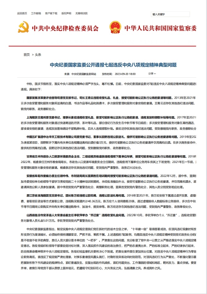 《中央紀委國家監(jiān)委公開通報七起違反中央八項規(guī)定精神典型問題》